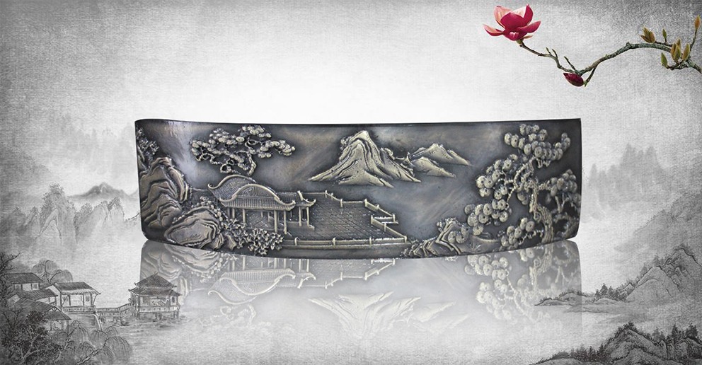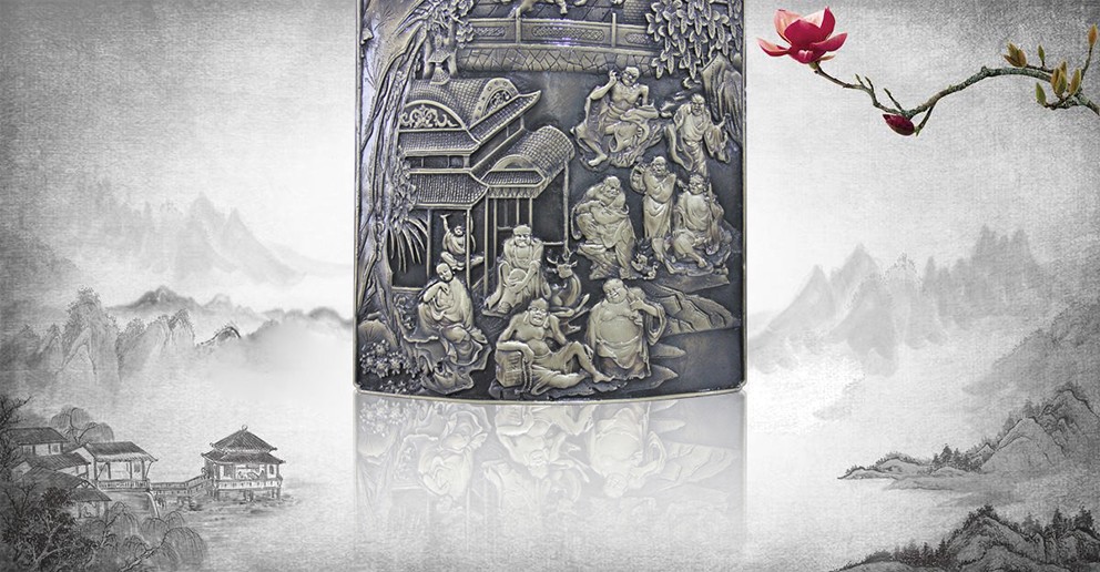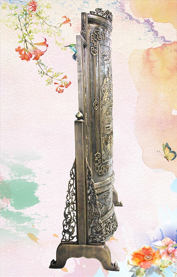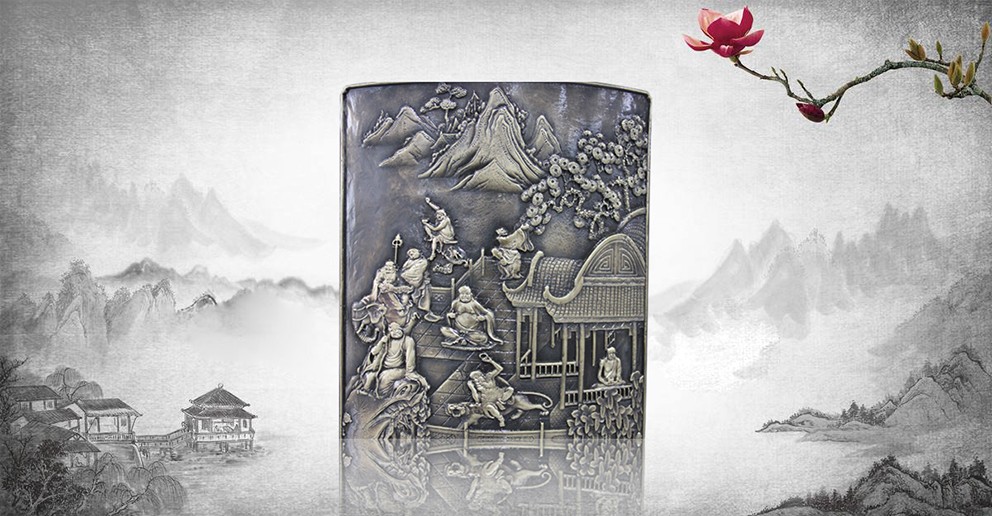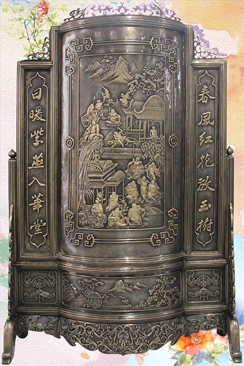 此幅青銅鑄造的《十八羅漢插屏》,是從一友人收藏的大約清中期紅木插屏上翻模制成的。整體上看玲瓏天成,布局精巧。從工藝上看雕法嫻熟,匠心獨(dú)具。特別是十八羅漢,個(gè)個(gè)活靈活現(xiàn)、栩栩如生。作者通過(guò)板塊錯(cuò)落的布局,使畫(huà)面生動(dòng)起來(lái),產(chǎn)生了上乘的視覺(jué)效果。